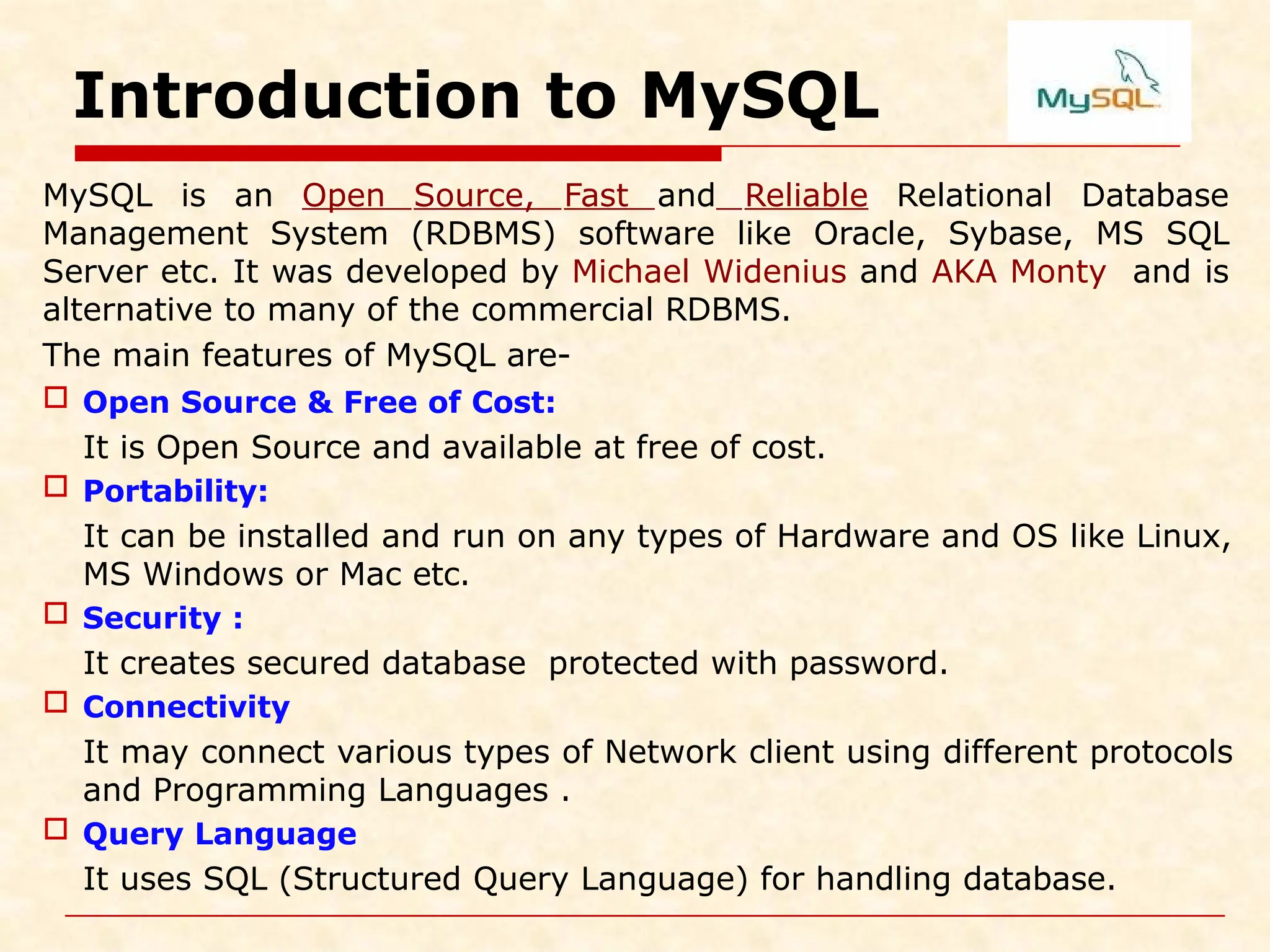 Server etc. It was developed by Michael Widenius and AKA Monty and is