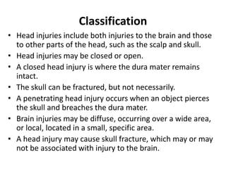 This document discusses the rehabilitation of head, neck, and facial injuries. It describes various types of head injuries such as closed and open head injuries, skull fractures, and traumatic brain injuries including concussions. Common symptoms and complications of head injuries are outlined. The diagnosis and management of head injuries through imaging, surgery, and monitoring for complications is covered. Rehabilitation of neck injuries through physiotherapy, manipulation, electrotherapy, anti-inflammatory drugs, and exercises is also summarized.