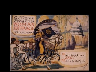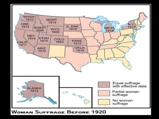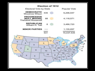 The document provides an overview of the Progressive Era in the early 20th century in the United States. It discusses the origins of progressivism and goals of reformers to protect social welfare, promote moral improvement, create economic reform, and foster efficiency. Some key reforms discussed include regulating large businesses, protecting workers and consumers, and expanding women's rights. Trust-busting and environmental conservation were priorities under President Theodore Roosevelt. His successor Taft continued reforms but lost popularity. Woodrow Wilson then enacted additional reforms as part of his "New Freedom" agenda.