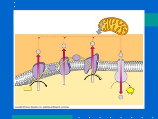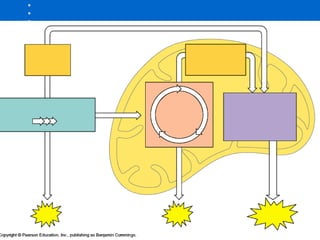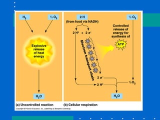 Cellular respiration harvests chemical energy from organic compounds like glucose to produce ATP. It occurs in three main stages: glycolysis, the Krebs cycle in the mitochondria, and the electron transport chain. During these stages, electrons are transferred through electron carriers like NADH and FADH2 to oxygen, releasing energy used to synthesize ATP through oxidative phosphorylation. The overall reaction oxidizes glucose and reduces oxygen to produce carbon dioxide, water, and 38 ATP per glucose molecule. When oxygen is limited, fermentation allows glycolysis to continue by reducing pyruvate to ethanol or lactic acid instead of entering the Krebs cycle.