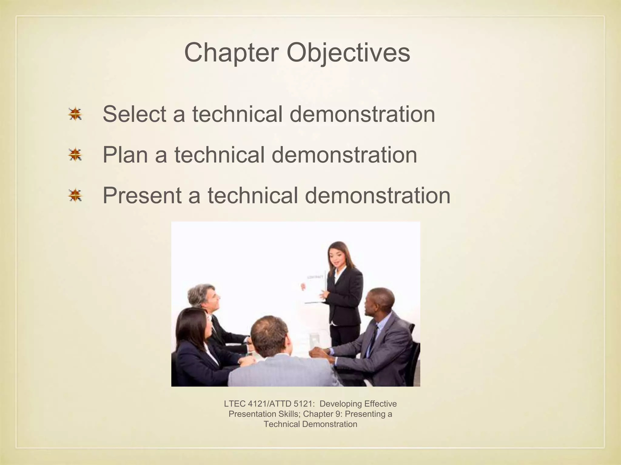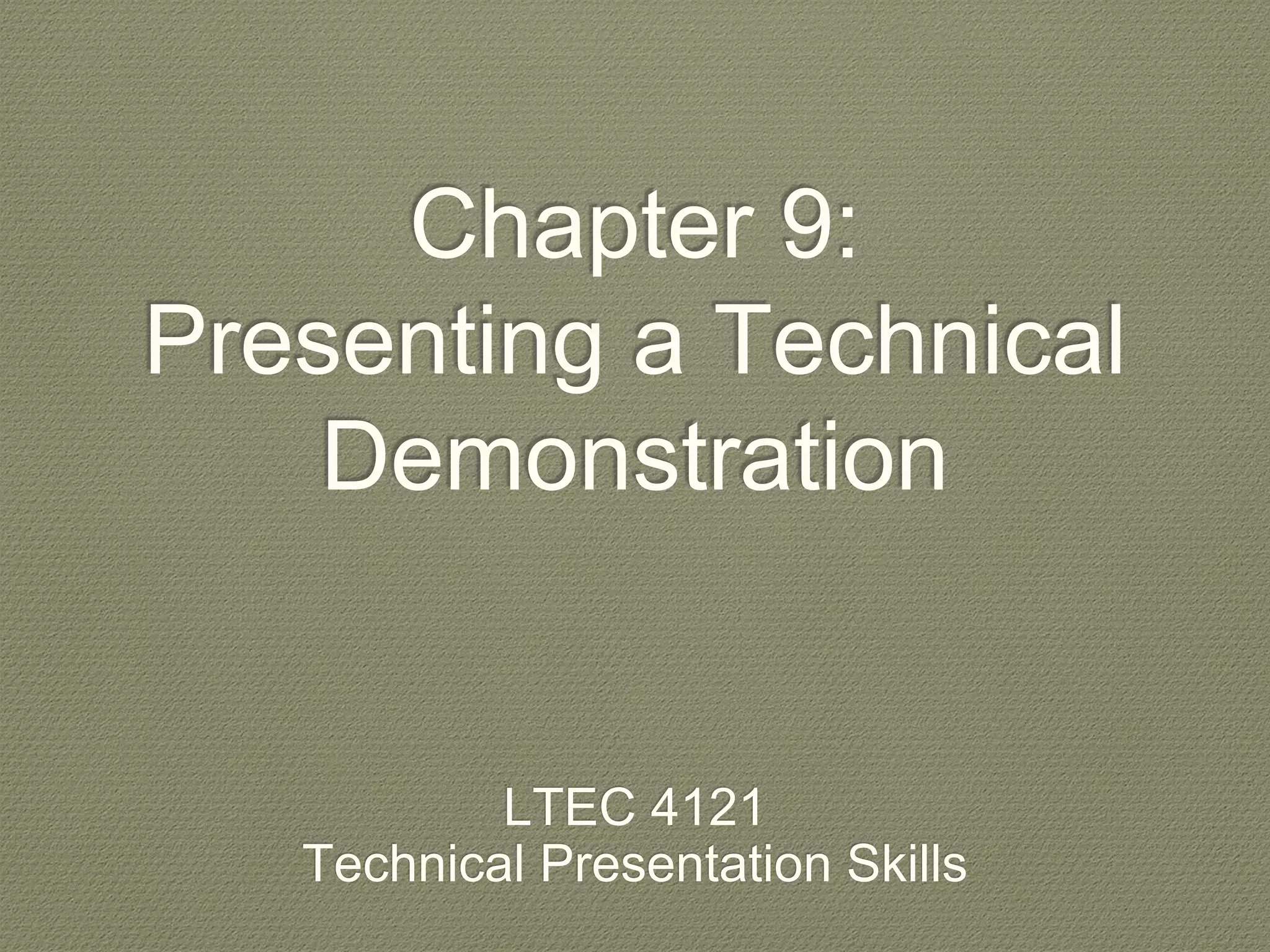 This chapter discusses how to plan and deliver an effective technical demonstration presentation. It emphasizes practicing the demonstration steps extensively beforehand to avoid failures. When delivering the demonstration, presenters should go through each step slowly, check for understanding, and allow time for participants to practice. An ideal technical demonstration breaks complex procedures into clear, manageable segments and reinforces the learning with a summary and practice opportunities.