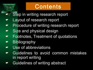 The document provides guidance on writing research reports. It discusses the key components of a research report such as the introduction, literature review, methodology, findings, and conclusion. It outlines the typical structure of a research report including preliminary pages, the main text, and end matter. The document also provides guidelines on formatting requirements, treatment of quotations, footnotes, bibliography, abbreviations, and common mistakes to avoid in report writing. It emphasizes that a research report should have a focused question, analyze and interpret data to answer the question, and specifically state findings and their significance.