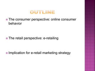 The document discusses online consumer behavior and e-retailing from both the consumer and retail perspectives. It examines key issues like customer profiles, beliefs and experiences that impact online shopping. It also looks at the development of e-retailing and various formats and operational strategies used. The implications for e-retail marketing strategies are also discussed.