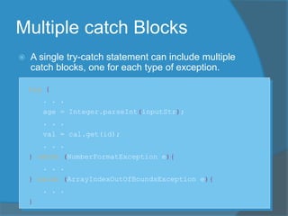 This document discusses multiple catch blocks and the finally block in Java exception handling. It explains that a try-catch statement can have multiple catch blocks to handle different exception types, with only the matching catch block executing. The catch blocks should be ordered from most specific to most general exception types. The finally block allows executing code regardless of whether an exception occurred or not.