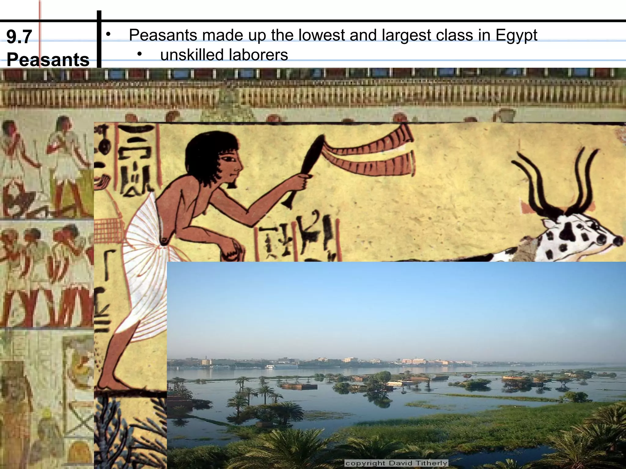 Peasants made up the largest social class in ancient Egypt and were responsible for producing the country's food supply through farming. They depended on the three seasons of the Nile River - flooding, planting, and harvest - to grow crops like wheat and barley. Peasants lived with few comforts in mud brick houses with mats for furniture and subsisted on meals of vegetables, fish, and bread, rarely eating meat. Failure to meet harvest quotas could result in famine and severe punishment for peasants.