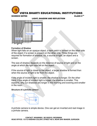 Light travels in a straight line and can be reflected off objects. There are three types of objects: transparent objects that light can pass through clearly, translucent objects that light can pass through faintly, and opaque objects that block light. A shadow is formed when an opaque object blocks light from a source to a screen. The size of a shadow depends on the distance and angle of the light source. Reflection occurs when light bounces off a shiny surface like a mirror.