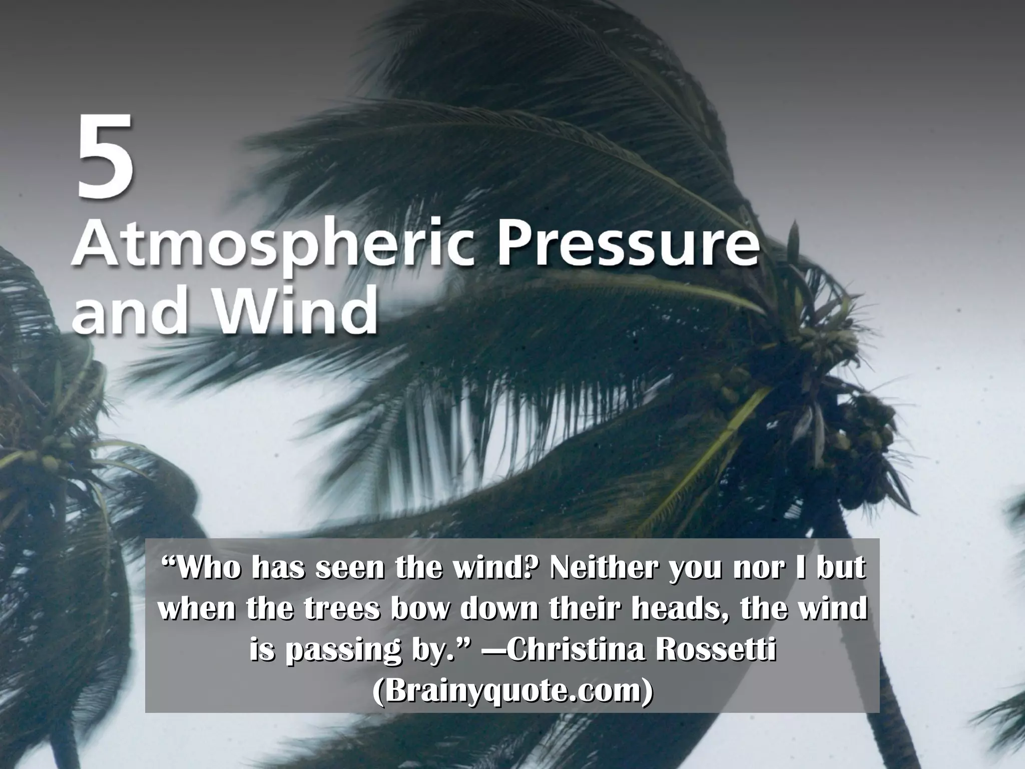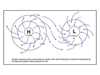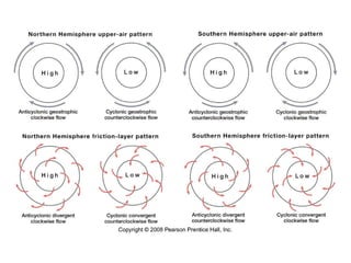This document summarizes key concepts about atmospheric pressure and global wind patterns from a geography textbook chapter. It defines important terms like isobars, high and low pressure systems, and describes the major wind systems - including the trade winds, westerlies, and polar easterlies - that make up the general circulation of the atmosphere. Specific wind patterns like the Hadley cell and subtropical high are explained in terms of atmospheric pressure gradients and the Coriolis effect.