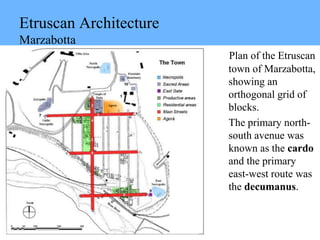 Roman buildings developed from Greek and Etruscan precedents and were found across the Roman Empire. Distinctive public building types included amphitheaters, baths, theaters, and basilicas which served urban culture. Houses ranged from apartments to palaces and villas. Roman engineering created dramatic interior spaces through arched vaults and domes, and used durable concrete. Cities followed an orthogonal grid plan with civic buildings like forums and temples.