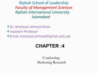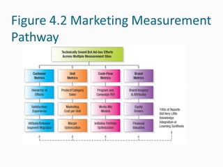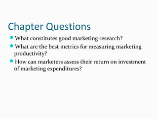 The document discusses marketing research and outlines the marketing research process. It describes defining the problem, developing a research plan by determining data sources, research approaches, instruments, and sampling. It also discusses analyzing information and presenting findings to make decisions. Key aspects of marketing research include systematically designing, collecting, analyzing, and reporting data to address a specific marketing situation. Metrics for measuring marketing include awareness, market share, satisfaction, and internal measures like commitment and resources. Marketing-mix modeling analyzes various data sources to understand the effects of specific marketing activities.
