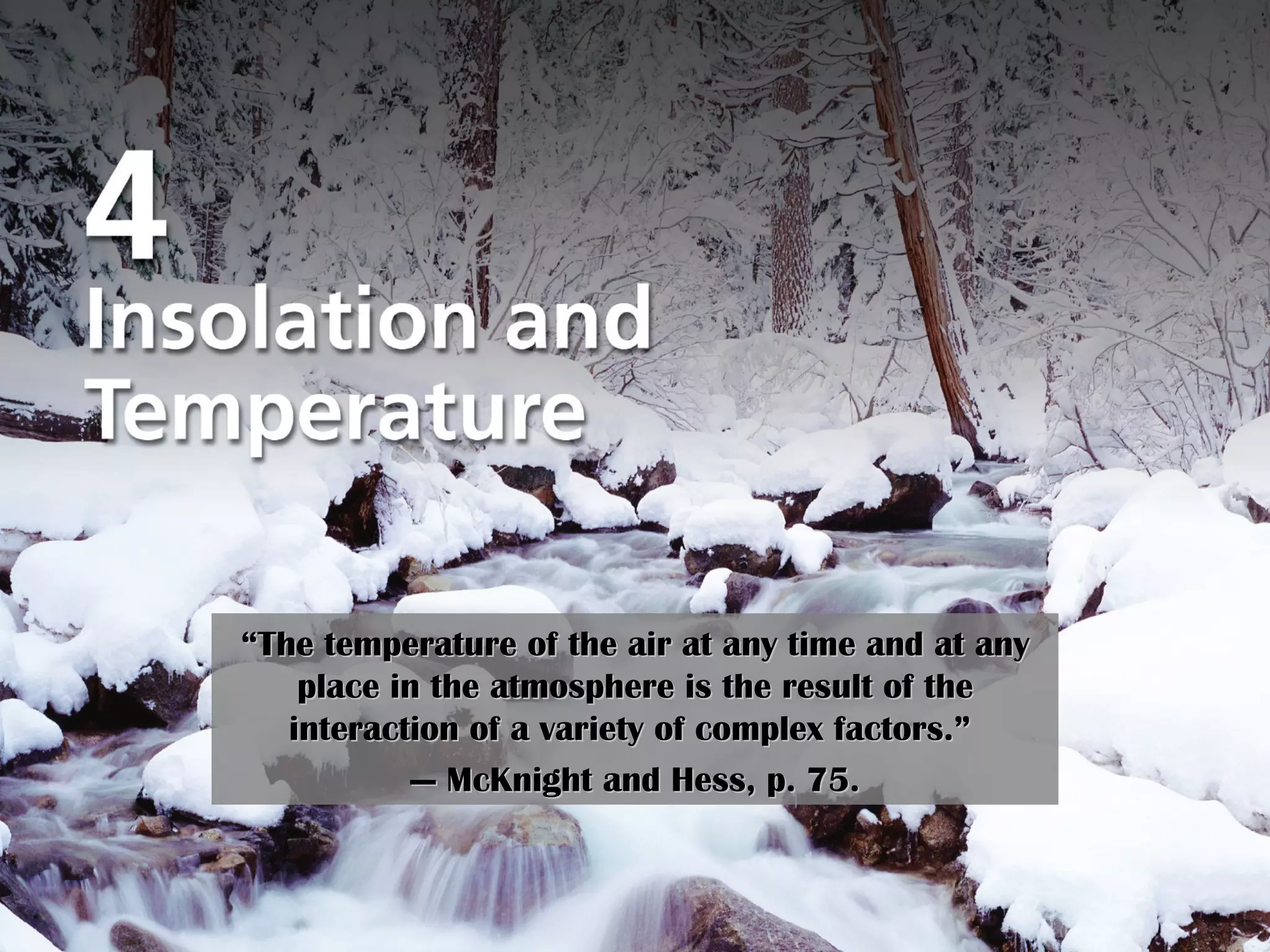 The document discusses various factors that influence air temperature, including solar radiation, greenhouse gases, conduction, convection, and latitude. It explains that air temperature results from complex interactions between these factors, such as different surfaces absorbing radiation differently, greenhouse gases trapping outgoing radiation, and rising air cooling through expansion.