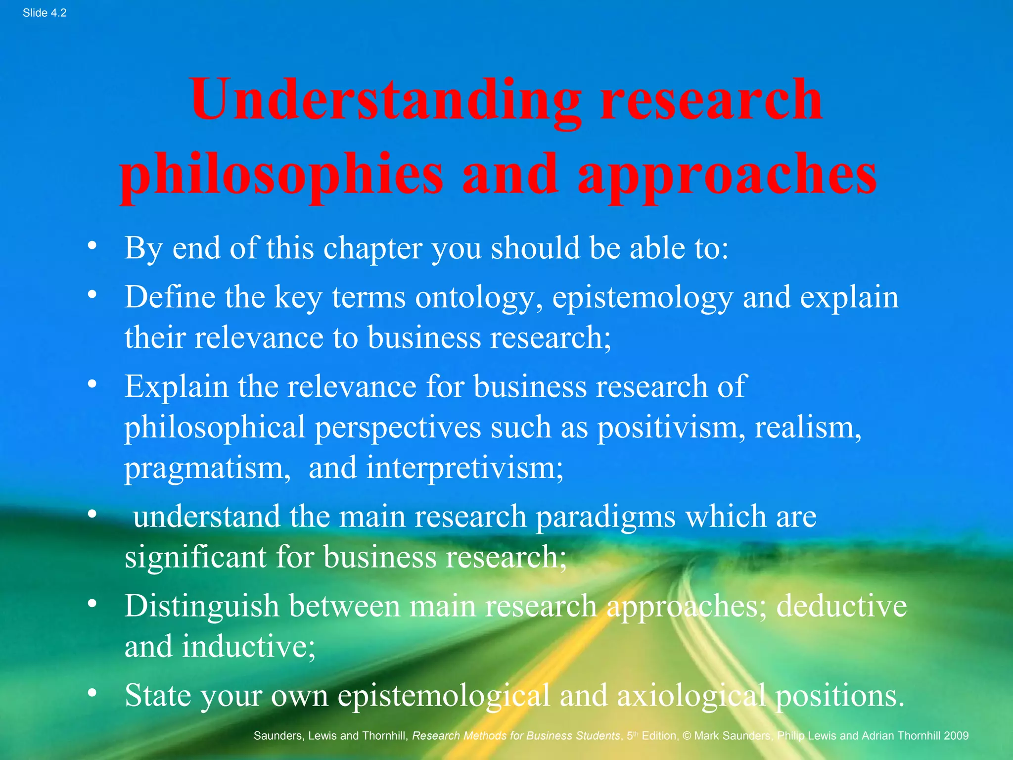 The document discusses research philosophies and approaches. It defines key terms like ontology, epistemology, and research paradigms. It explains philosophies like positivism, realism, and interpretivism. It also distinguishes between deductive and inductive research approaches and how to choose the right approach based on factors like the research topic and time available.