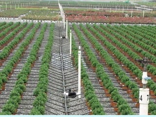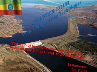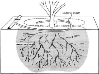 This document discusses various irrigation methods including surface, subsurface, and pressurized irrigation. Surface irrigation methods like basin, border, and furrow irrigation distribute water over the field surface through controlled flooding. Pressurized methods like sprinkler and drip irrigation apply water under pressure through pipes and emitters. The selection of an irrigation method depends on factors like soil type, slope, crop type, water availability, and climate. Land leveling is also discussed to create suitable field surfaces for water flow control.