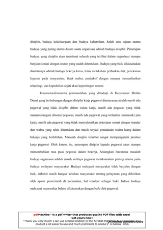 Dokumen tersebut membahas tentang disiplin kerja, kepuasan kerja, budaya organisasi, dan prestasi kerja pegawai di Kecamatan Medan Denai. Ia menjelaskan pentingnya disiplin kerja dan kepuasan kerja untuk meningkatkan prestasi kerja, serta pengaruh budaya organisasi yang mendukung terhadap penerapan disiplin kerja. Tujuan penelitian ini adalah menganalisis pengaruh faktor-faktor tersebut terhadap prestasi kerja pegaw