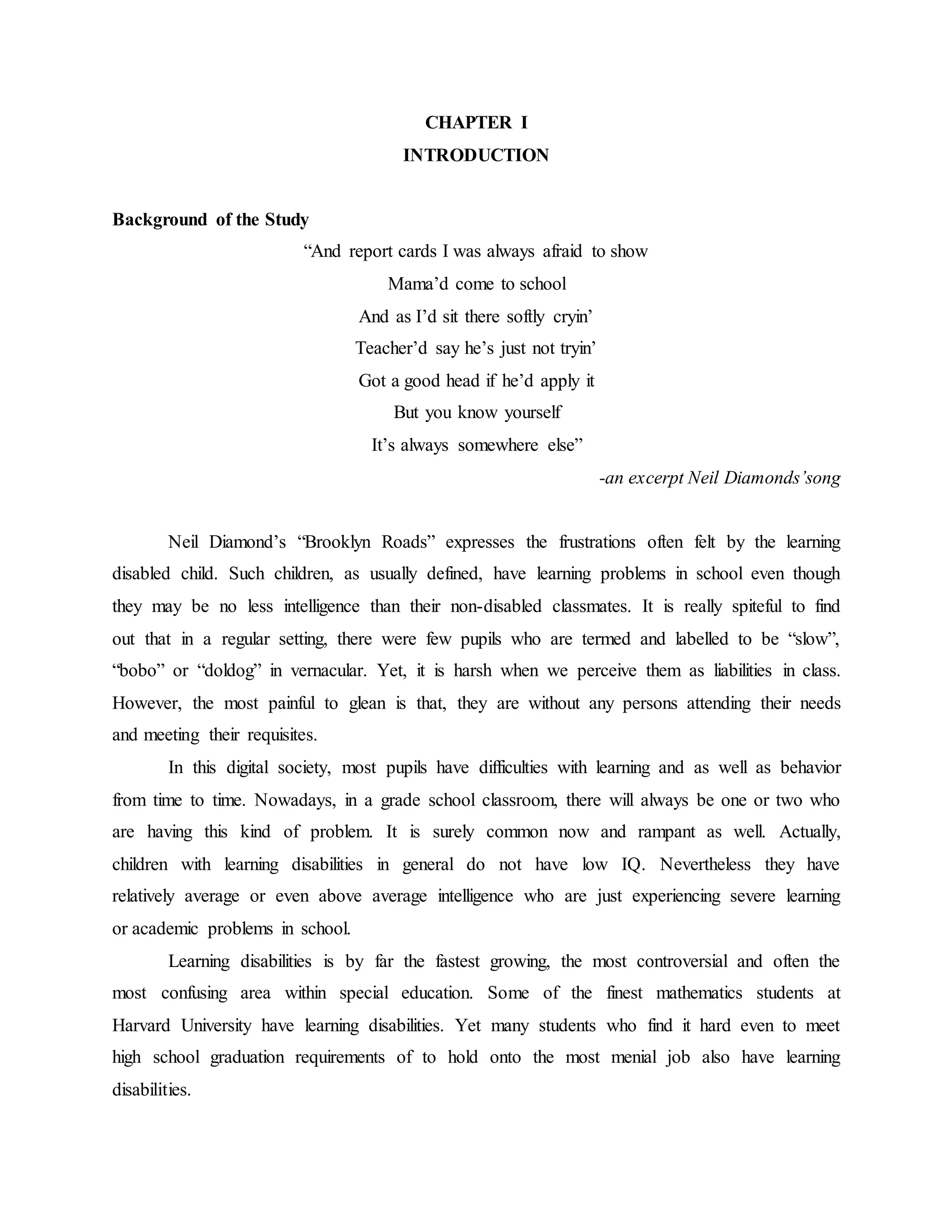 This document provides background information on learning disabilities. It discusses how learning disabilities can affect children's performance in school even if they are of average or above average intelligence. It states that the prevalence of learning disabilities among school-aged children is estimated between 6-8%. The document then outlines the statement of the problem, significance of the study, scope and delimitations, and defines key terms related to specific types of learning disabilities.