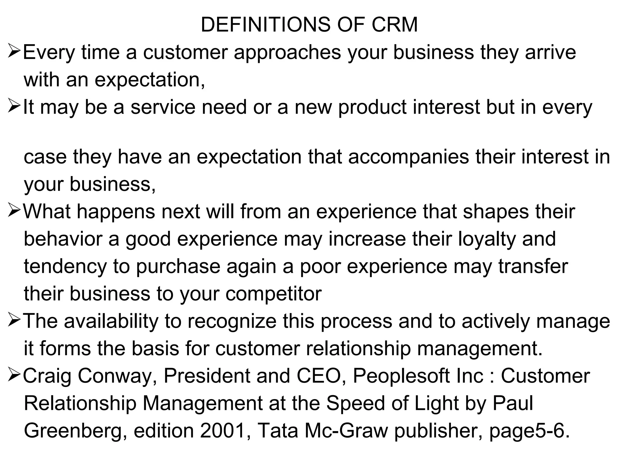 The document discusses definitions and evolution of customer relationship management (CRM). It defines CRM as understanding customer behavior through communications to improve acquisition, retention, loyalty and profitability. The evolution of CRM involved stages from mass marketing to direct marketing to target marketing to the current stage of CRM, which uses customer data and analytics to personalize interactions and maximize customer lifetime value. CRM aims to identify, establish, maintain and enhance mutually beneficial relationships with customers.