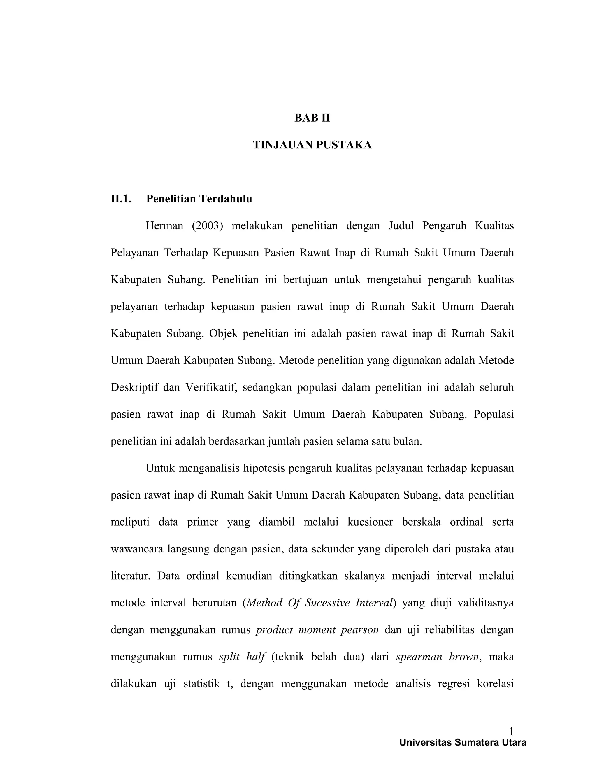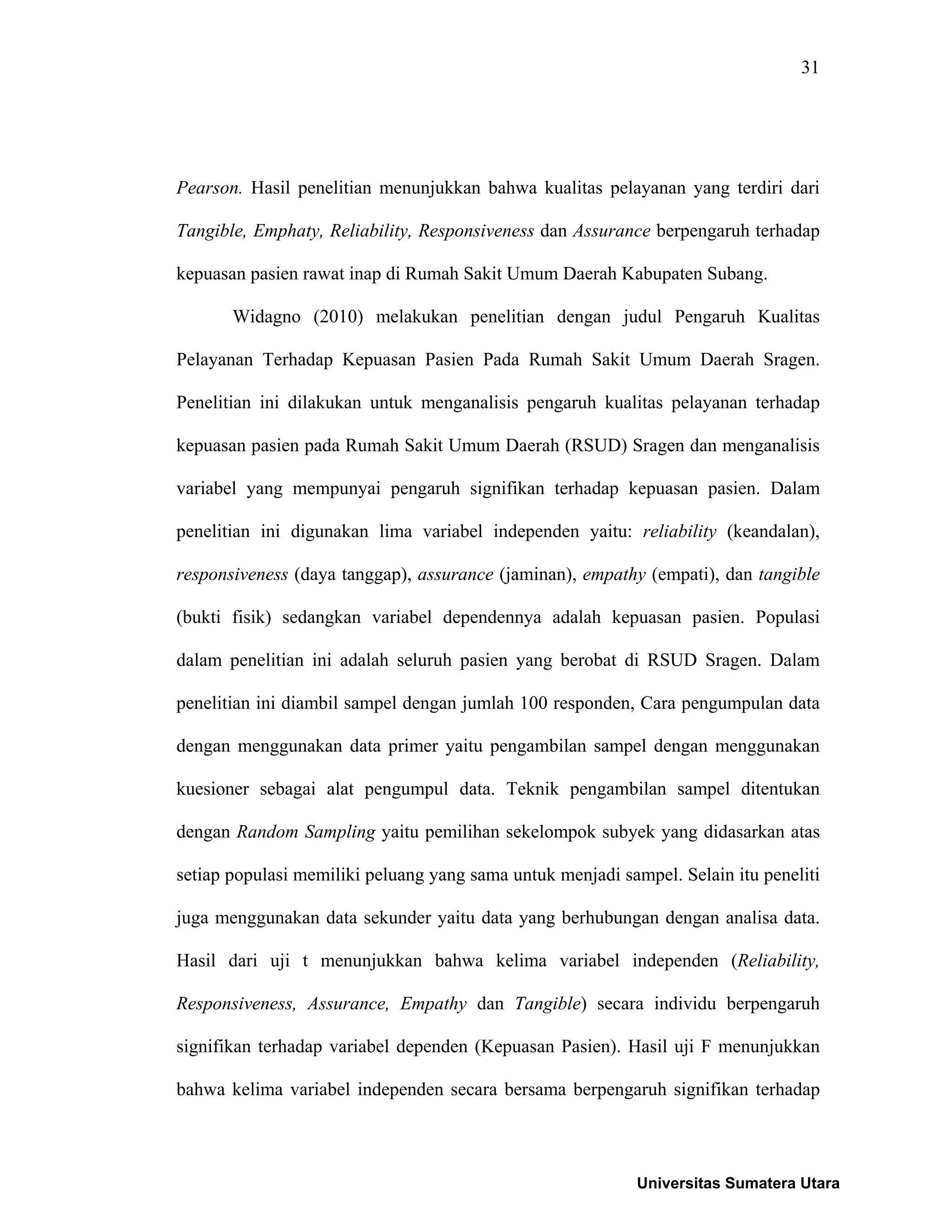 Dokumen ini membahas penelitian yang menganalisis pengaruh kualitas pelayanan terhadap kepuasan pasien di rumah sakit, dengan fokus pada variabel seperti reliability, responsiveness, assurance, empathy, dan tangible. Penelitian menunjukkan bahwa kualitas pelayanan berpengaruh signifikan terhadap kepuasan pasien dan menjelaskan berbagai karakteristik serta dimensi kualitas pelayanan. Selain itu, juga dijelaskan definisi dan teori mengenai pelayanan serta pentingnya memenuhi harapan pelanggan untuk mencapai kepuasan.