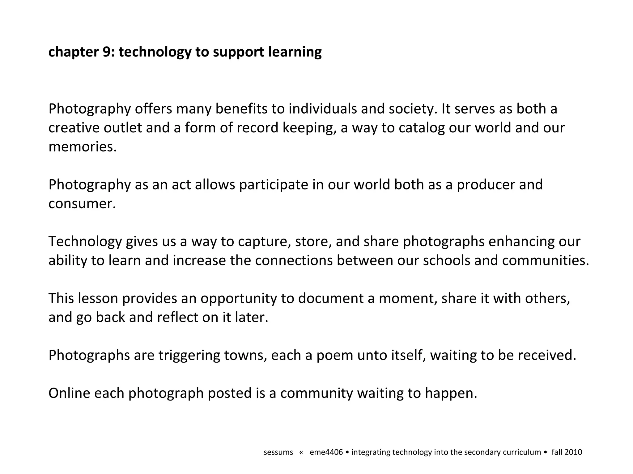 Photography allows for creative expression and documentation of memories and the world. It allows people to both produce and consume photographs. Technology enhances our ability to capture, store, and share photographs, strengthening connections between schools and communities. This lesson provides an opportunity for students to document a moment, share it with others, and revisit it later through photographs. Online photographs posted can start online communities.