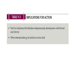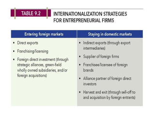 This chapter discusses entrepreneurship and growing entrepreneurial firms internationally. It defines key terms like entrepreneurship, entrepreneurs, and international entrepreneurship. It identifies three characteristics of growing entrepreneurial firms: innovation, financing, and microfinancing. It also differentiates between international strategies of entering foreign markets versus staying in domestic markets, giving examples like indirect exporting and using export intermediaries.