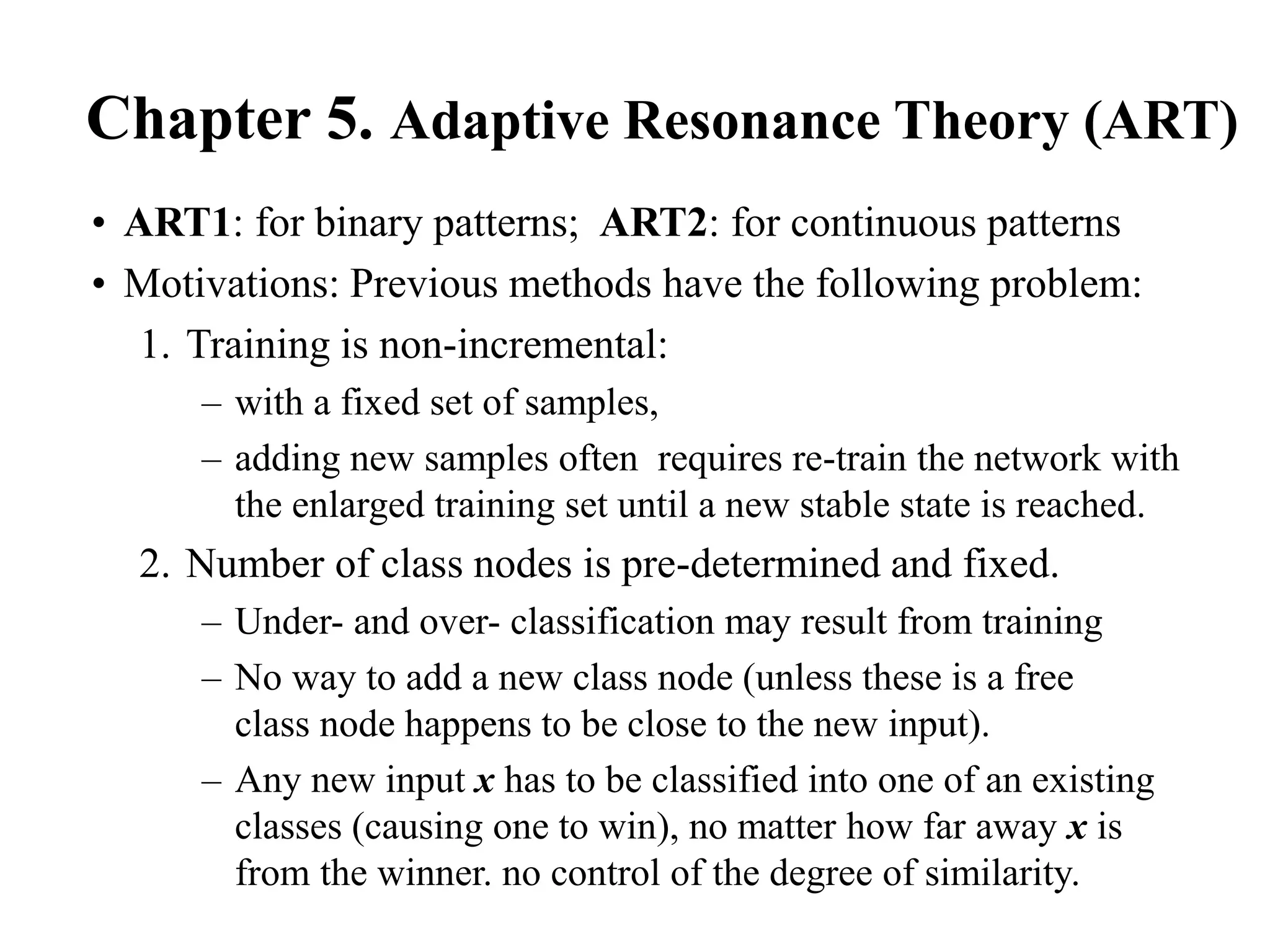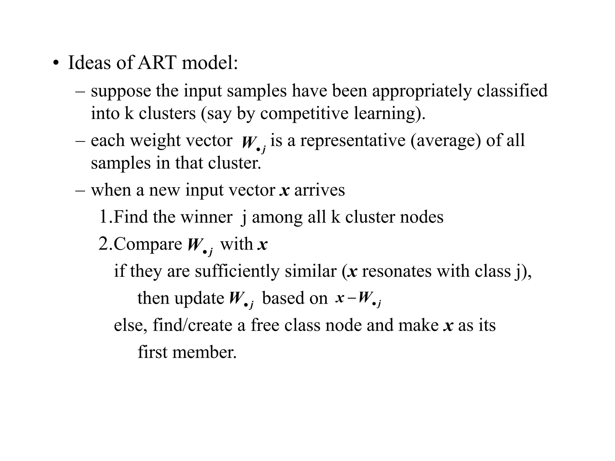 This document summarizes Adaptive Resonance Theory (ART), which was developed to allow neural networks to incrementally learn new patterns without forgetting old ones. ART1 is designed for binary patterns and ART2 for continuous patterns. The key ideas are to find the most similar existing cluster for a new input, and if it is not sufficiently similar, create a new cluster. The architecture uses input, cluster, and interface units connected by adaptive weights to classify inputs through resonance or create new clusters when needed.