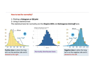 The document outlines various statistical techniques for analyzing independent and paired samples, including applications of ANOVA, Mann-Whitney U test, paired samples t-test, and correlations. It details how to choose appropriate tests based on the distribution of data and relationships between variables, specifically giving guidance on scenarios involving gestational age, anxiety levels, and nutritional supplements. Additionally, it explains the rationale behind using specific tests depending on whether the data is normally distributed or not.