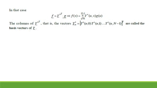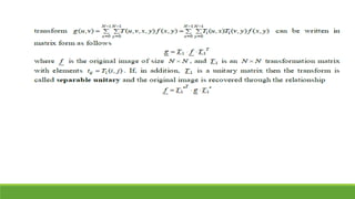 This document provides an overview of various image transforms including unitary transforms, the discrete Fourier transform (DFT), the discrete cosine transform (DCT), the Walsh transform, the Hadamard transform, and the Karhunen-Loeve transform (KLT). It describes the mathematical definitions and properties of each transform, highlighting their uses in applications like image enhancement, compression, and feature extraction. In particular, it explains how transforms can reveal insights into image properties by working with image transforms rather than raw pixel values.