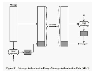 This document provides an overview of approaches to message authentication and public-key cryptography. It discusses secure hash functions like SHA-1 and HMAC for message authentication codes. For public-key cryptography, it describes the principles including key distribution and encryption/decryption with public/private key pairs. Specific public-key algorithms covered are RSA, Diffie-Hellman key exchange, and their applications for encryption, digital signatures, and key exchange. Requirements and examples of the RSA algorithm are also summarized.