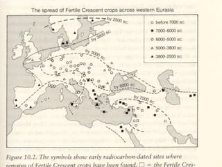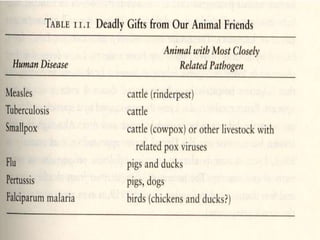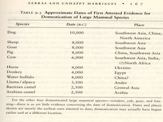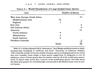 - Diamond's theory that Western societies became dominant due to geographic and environmental factors that gave them earlier starts with agriculture, animal domestication, and resistance to diseases, allowing greater technological advances.