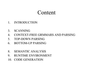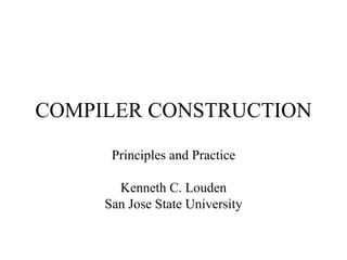 This document provides an overview of compiler construction principles and practices. It introduces the basic components of a compiler, including scanning, parsing, semantic analysis, code generation, and optimization phases. It also discusses related tools like assemblers, linkers, and debuggers. The document outlines the translation process from source code to target code and describes major data structures used in compilers like symbol tables and syntax trees.