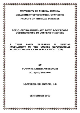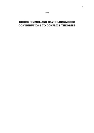 Georg Simmel and David Lockwood made important contributions to conflict theory. Simmel proposed that conflict has sociological significance as it produces or modifies communities of interest and organizations. He argued that conflict itself resolves tensions between opposing elements and aims for a type of unity, even if through the annihilation of one side. Lockwood studied conflict dimensions and types. He distinguished between typologies that classify conflicts and dimensions that can apply to all conflicts and influence their dynamics. Both theorists recognized conflict as an inherent and sometimes productive part of social relationships rather than something purely negative.