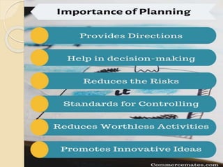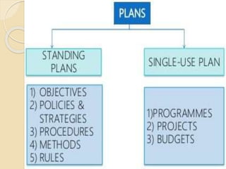 The document discusses the concept and importance of planning in management, highlighting its role in setting objectives, decision-making, and shaping organizational direction. It outlines the characteristics of effective planning, its benefits, limitations, and various types of plans including single-use and standing plans. Additionally, the document elaborates on the planning process, which involves setting objectives, developing premises, identifying and evaluating alternatives, and implementing plans to achieve organizational goals.