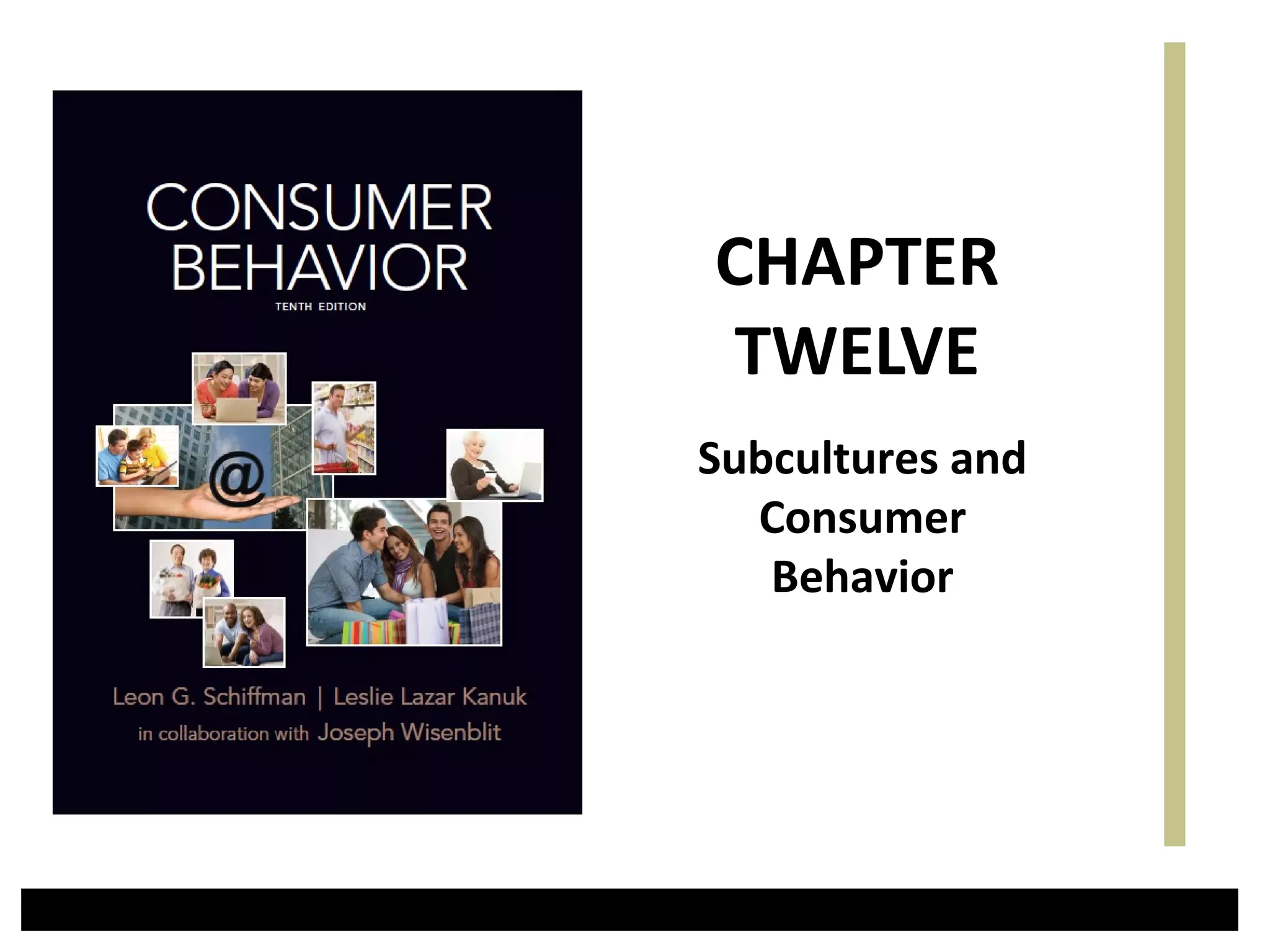 This document discusses various subcultures and how they relate to consumer behavior. It defines subculture as a distinct group within a larger society and explores examples like nationality (discussing Hispanics), religious, regional, racial, age-based (generations, older consumers), gender-based and working women subcultures. Each subculture exhibits trends in consumer preferences, brand loyalty, media usage and spending habits. The document stresses the importance for marketers to understand how multiple, overlapping subcultural identities influence consumer behavior.