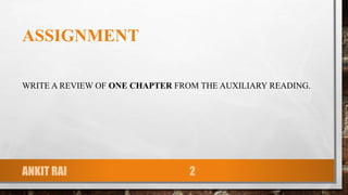 This document provides instructions for writing a review of one chapter from an auxiliary reading. The review must be 5-6 pages long with specific formatting and include: an introduction with the chapter's thesis, discussion of 3-4 main points from the chapter, background on the author, a personal evaluation, and a conclusion assessing if the author accomplished their purpose. The review must be the student's own writing with no more than two brief quotes cited from the chapter.