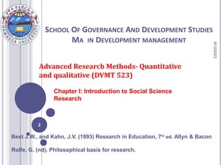 The document outlines advanced research methods in quantitative and qualitative research, exploring the definition, purpose, and types of research. It discusses the scientific methodology, including problem identification and hypothesis testing, while emphasizing the importance of both basic and applied research. Philosophical foundations of research, including various epistemological approaches, and the nature of different research designs are also elaborated upon.