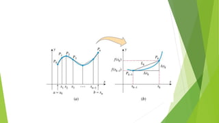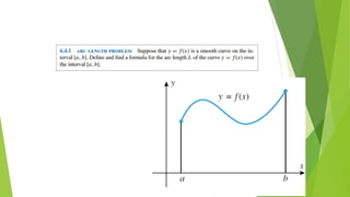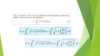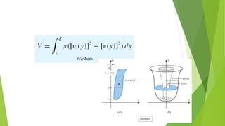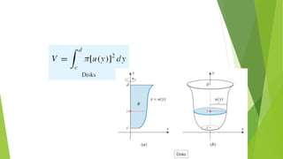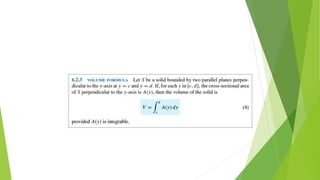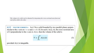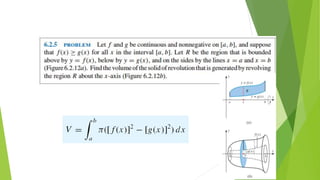 This document provides an overview of chapter six which discusses applications of the definite integral in geometry, science, and engineering. It introduces how definite integrals can be used to calculate volume, surface area, length of a plane curve, and work done by a force. It reviews key concepts like Riemann sums and finding the area between two curves. It then explains the specific applications of using integrals to find volume of solids obtained by rotating an area about an axis, surface area of revolution, and work done by a variable force. Examples are provided for each application.