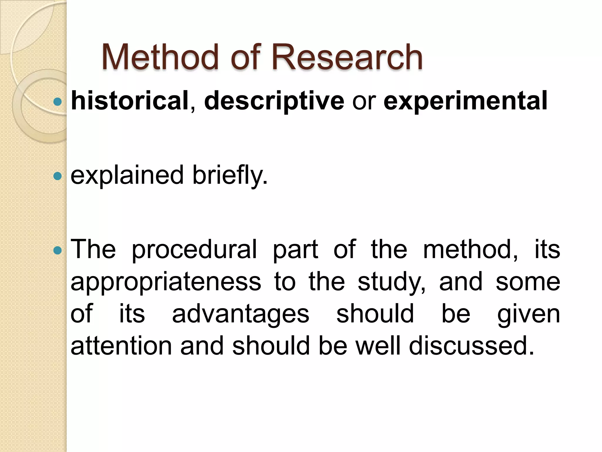 The document outlines the key components of a research methods chapter, including the research method used, population and sampling design, research instrument, data gathering procedure, and statistical treatment. It provides examples and guidelines for how to describe each component, such as defining the research method, explaining the sampling technique and sample size, describing the structure of the research instrument, and discussing how data was collected and analyzed.