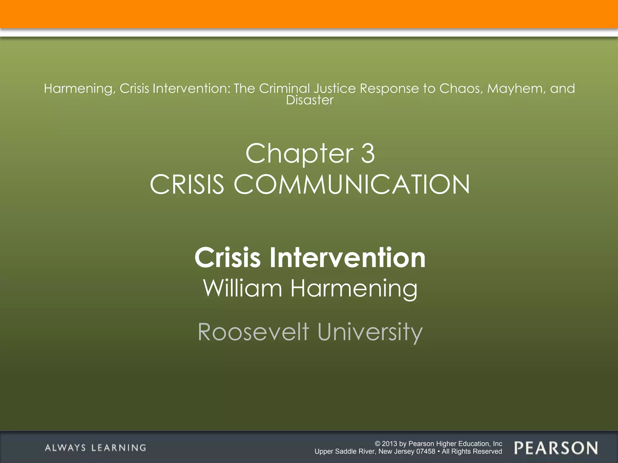 The document summarizes key concepts about crisis communication from Chapter 3 of the book "Crisis Intervention: The Criminal Justice Response to Chaos, Mayhem, and Disaster" by William Harmening. It discusses (1) the importance of communication in crisis intervention and containment/de-escalation, (2) Transactional Analysis as a model involving the Parent, Adult, and Child ego states, and typical communication patterns from each, and (3) specific communication patterns like parallel vs crossed transactions and hooking someone in crisis into a more rational discussion.