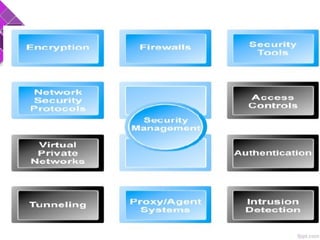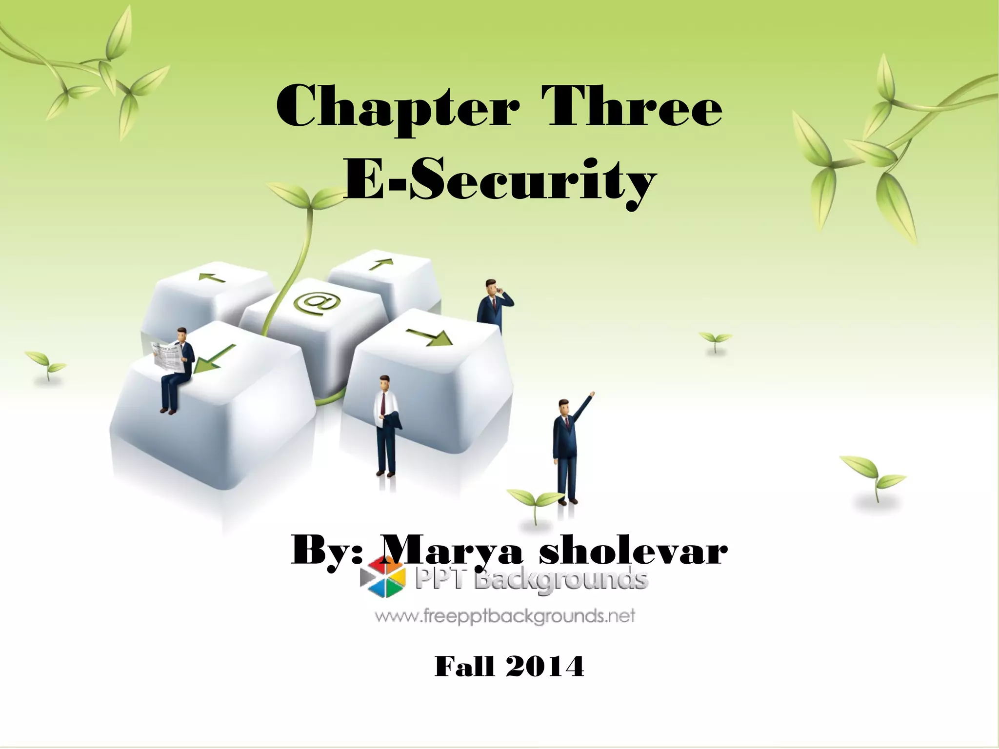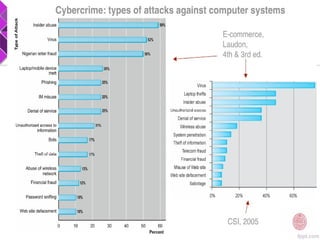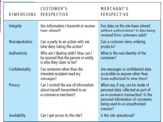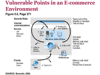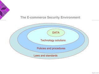 This document discusses e-commerce security threats and solutions. It outlines several security threats including malware, phishing, hacking, credit card and identity fraud. It also examines dimensions of e-security like integrity, authenticity, confidentiality and availability. The tension between security and ease of use is explored. Technology solutions to secure communications and networks through encryption, SSL, firewalls and anti-virus software are presented.
