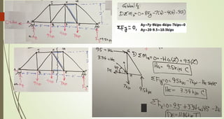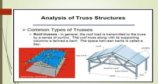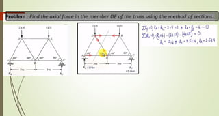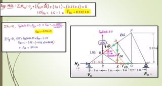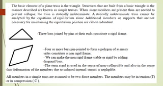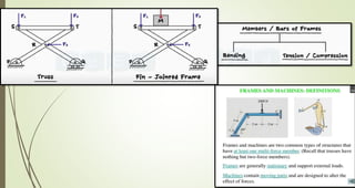 This document discusses the principles of trusses, frames, and machines, focusing on the analysis and stability of trusses. It details methods for force analysis including the method of joints and method of sections, as well as the identification of zero-force members. Additionally, it outlines steps for analyzing frames and machines to determine reaction forces and member stability.