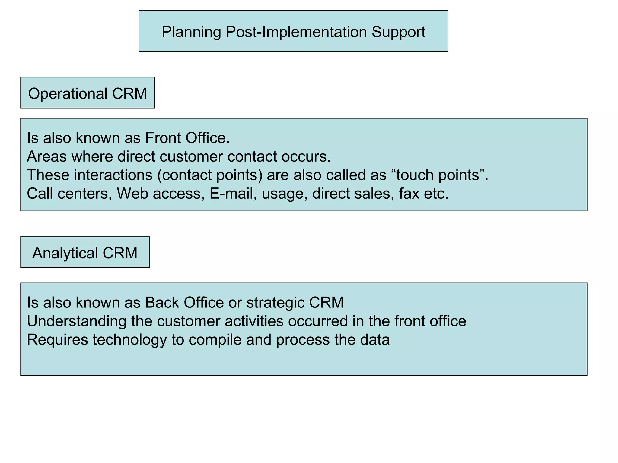 Operational CRM involves direct customer interactions through various touchpoints like call centers, websites, emails, sales interactions and faxes. Analytical CRM uses technology to compile and process operational data to understand customers and perform tasks like customer profiling, revenue analysis, churn analysis and campaign measurement. Collaborative CRM enables two-way dialogue between companies and customers through multiple channels to improve customer interactions and facilitate collaboration.