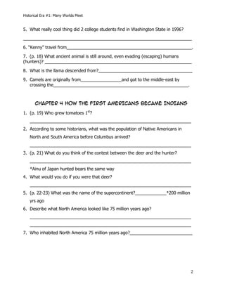 This document provides an overview of historical information about Native Americans. It includes chapter summaries that describe how early humans made tools, the geography during the ice age, Native American tribes like the Inuit and Anasazi, and how different tribes lived in places like the Arctic, Southwest, Plains, and Eastern forests. The summaries highlight aspects of Native American culture like housing, tools, hunting practices, and farming techniques used in different environments across North America.