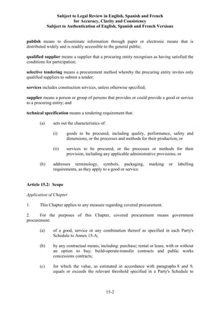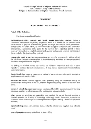 This document defines key terms related to government procurement in 3 countries. It establishes that the chapter applies to procurement of goods, services, and construction services above certain monetary thresholds. It outlines general principles of non-discrimination and national treatment. It allows for exceptions to protect safety, health, or intellectual property. It also establishes rules for publishing procurement notices, evaluating bids, and awarding contracts in a transparent manner.