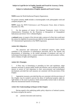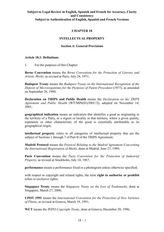 This document defines key terms related to intellectual property and outlines general provisions on intellectual property between the parties. It discusses objectives to promote innovation and technology transfer. It also addresses public health measures, international agreements, national treatment provisions, and transparency requirements related to intellectual property rights and their enforcement.