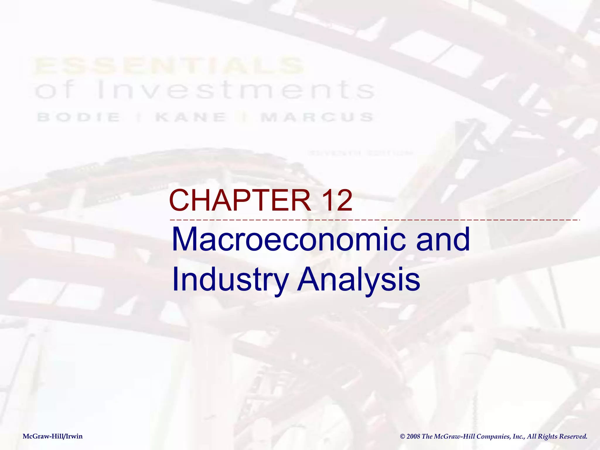 This document provides an overview of macroeconomic and industry analysis for fundamental analysis. It discusses analyzing the global economy, domestic macroeconomy, interest rates, demand and supply shocks, government policy, business cycles, and industry analysis. Key aspects covered include economic performance by country, key domestic economic variables, factors determining interest rates, types of demand and supply shocks, tools of monetary policy, leading/coincident/lagging economic indicators, defining and classifying industries, and how industry performance varies through the business cycle and industry life cycle.