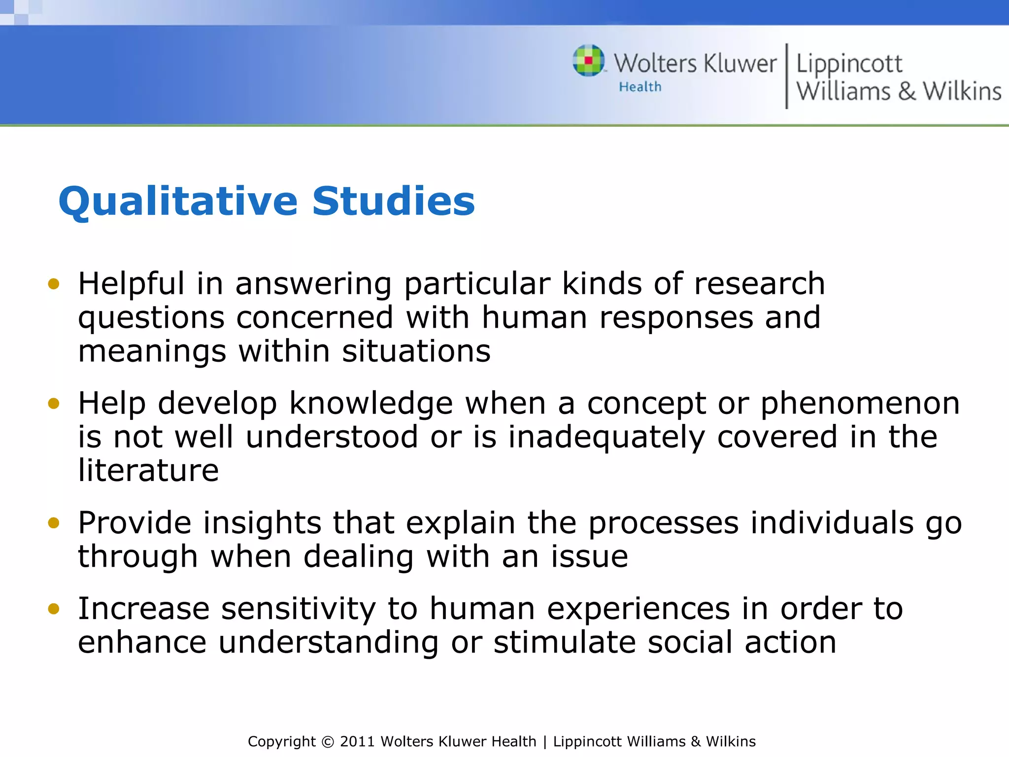 This document discusses key aspects of qualitative research design and methodology. It explains that qualitative research helps understand human experiences and meanings, provides insights into poorly understood concepts, and can stimulate social action. While not all descriptive research is qualitative, it focuses on interpretation and understanding. There is no single set of procedures, but mentorship yields high-quality results. Sample size is based on data usefulness rather than power analysis. Data collection may include interviews and observation, while analysis involves coding, categorizing, and identifying themes. Limitations like generalizability must be addressed.