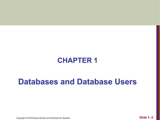 This document provides an overview of databases and database users. It begins with defining key terms like database, data, and DBMS. It then describes typical DBMS functionality, such as defining and loading a database, querying, and maintaining data integrity for concurrent users. The document uses a university database example to illustrate database concepts. It outlines the main characteristics of the database approach, including data independence and supporting multiple views. Finally, it discusses the types of database users and the advantages and historical development of database technology.
