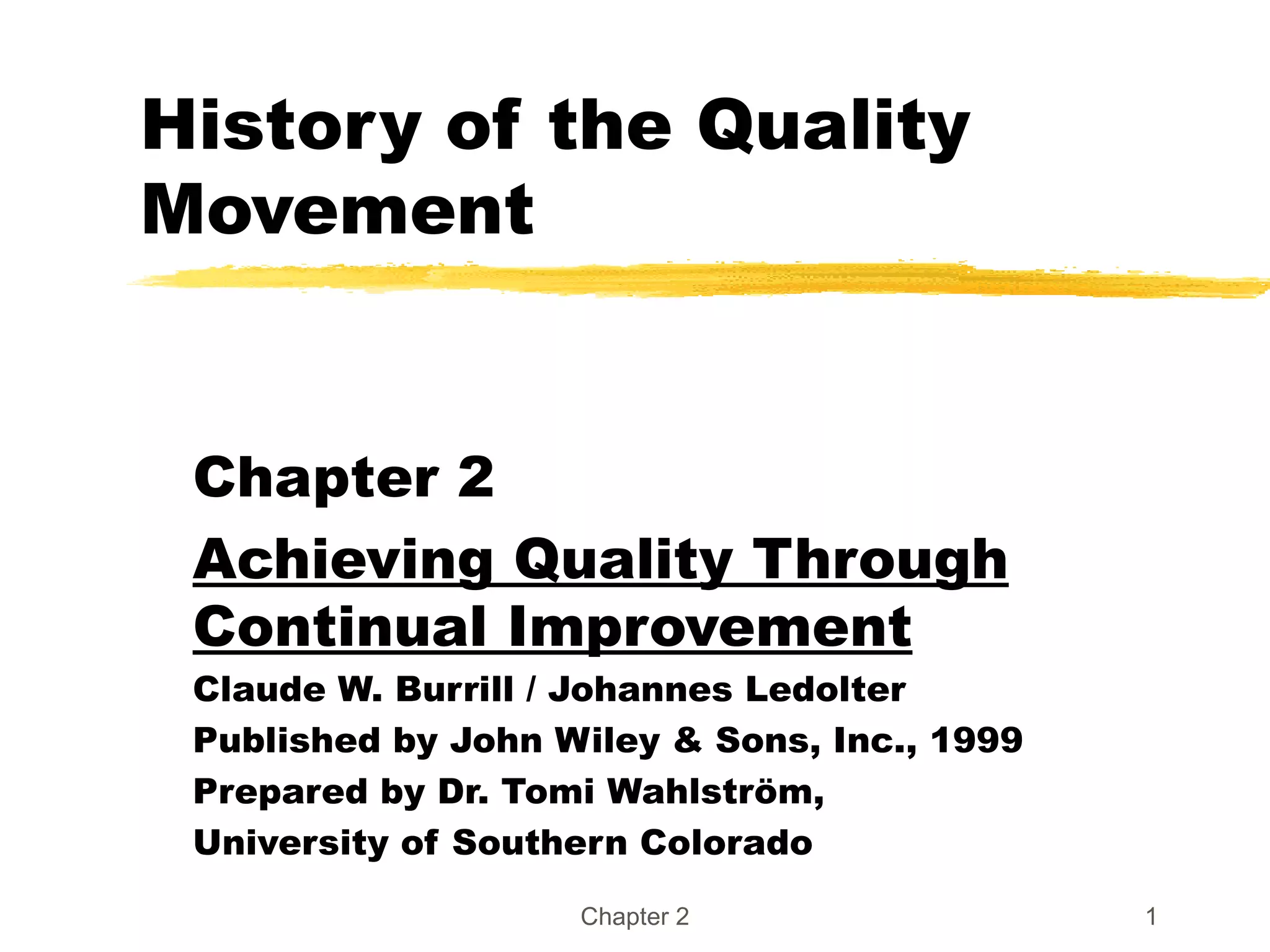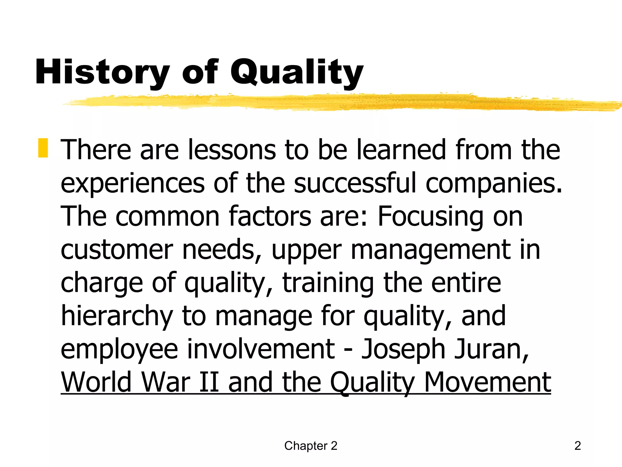 This chapter discusses the history and evolution of the quality movement. It describes how quality management originated at Bell Laboratories in the early 20th century and was further developed by experts like Walter Shewhart, W. Edwards Deming, and Joseph Juran. The chapter then outlines key events and developments in quality from World War II through the 1990s, including the postwar period when American manufacturers neglected quality, the Japanese rise in quality in the 1970s, and the emergence of total quality management in the 1980s. It concludes with five American leaders who were instrumental in advancing quality management.