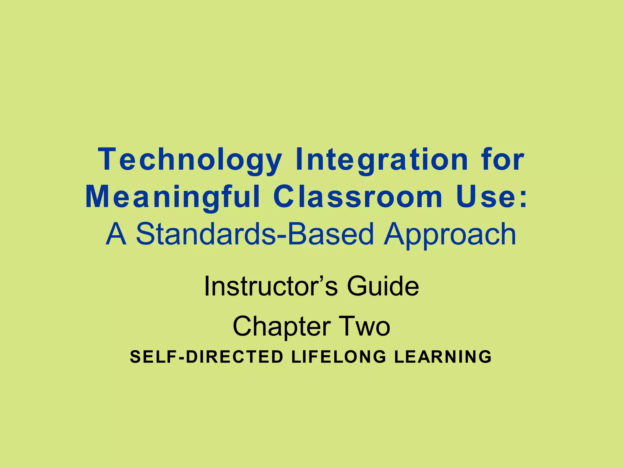 This chapter introduces the concept of self-directed lifelong learning. It discusses the ISTE NETS standards for teachers, which emphasize self-directed learning. The chapter presents a model for self-directed learning called the GAME plan, which involves setting goals, taking action, monitoring progress, and evaluating outcomes. It also discusses developing a portfolio to document skills and guide professional development. Readers are guided through self-assessing their technology skills and developing an initial portfolio and professional development plan.