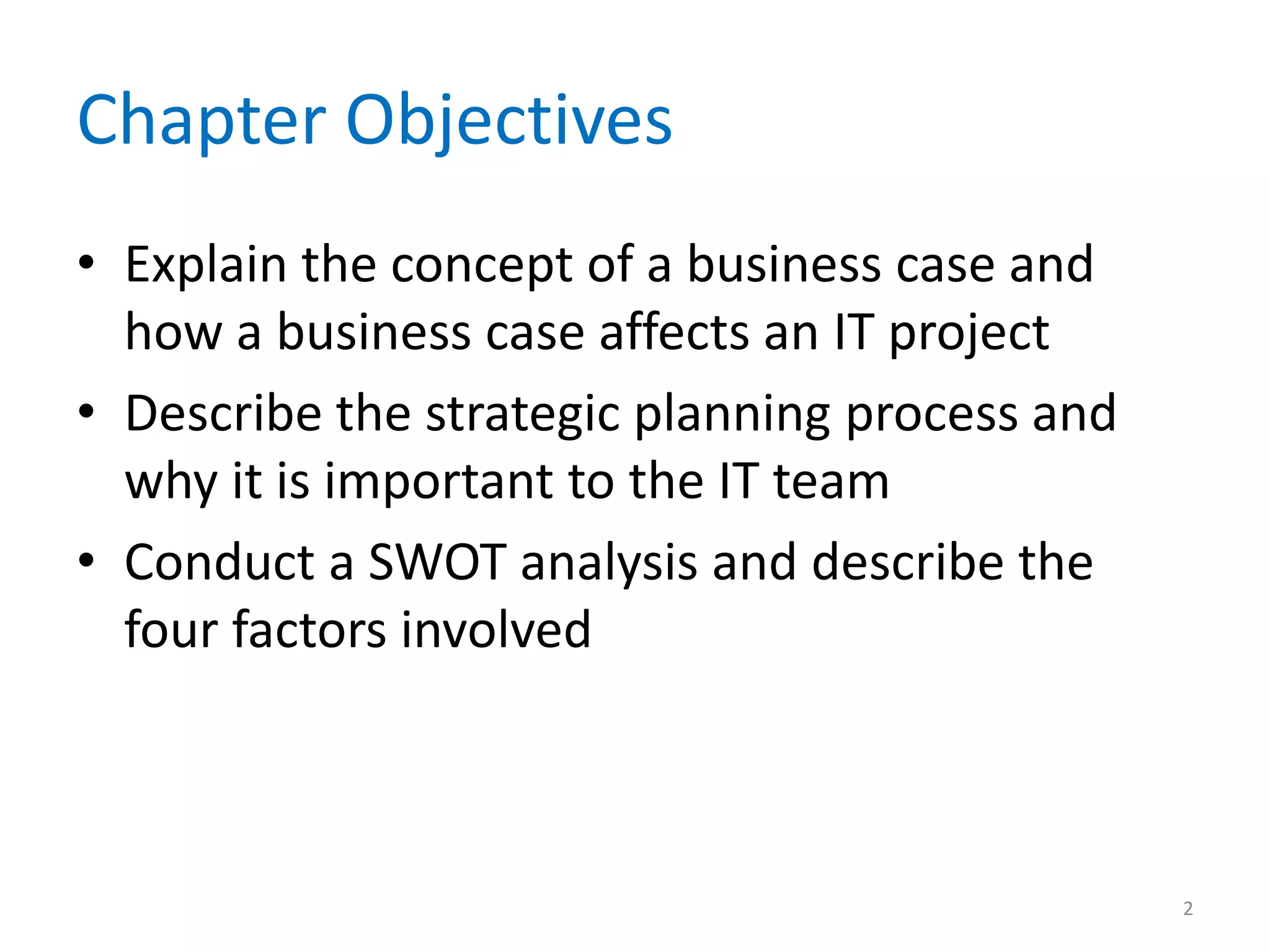 This chapter discusses analyzing the business case for IT projects. It explains that a business case justifies a proposed project based on reasons and benefits for the company. The chapter also describes strategic planning, which examines a company's vision and mission and leads to goals and objectives. Finally, the chapter outlines the preliminary investigation process, which includes understanding requirements, analyzing costs/benefits, and evaluating feasibility before presenting recommendations to management.