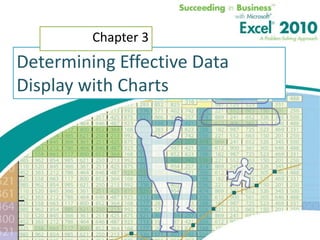 This chapter discusses different types of charts that can be used to visualize quantitative data in Excel. It covers basic chart types like line, column, and pie charts, as well as more advanced types like radar and bubble charts. The chapter also explores chart sub-types and how to combine multiple chart types into a single dashboard chart to analyze business data. The objectives are to determine the appropriate chart type for different situations, modify charts effectively, and create advanced visualizations like management dashboards.