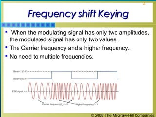 The document covers the fundamentals of frequency modulation (FM) and phase modulation (PM), including the principles of modulation, modulation index, and sidebands. It discusses how frequency deviation affects bandwidth and introduces concepts like frequency-shift keying (FSK) and binary phase-shift keying (PSK). The efficiency and signal-to-noise ratio of FM compared to AM are also highlighted.